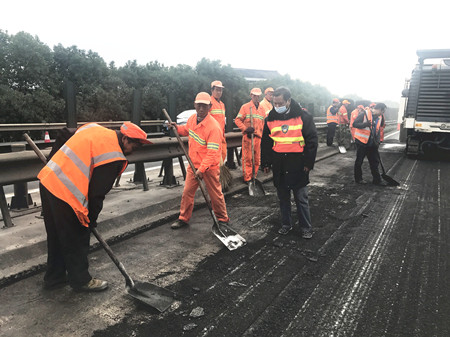 12月4日,難得的晴好天氣,甬臺(tái)溫高速公路臺(tái)州段一期路面專項(xiàng)養(yǎng)護(hù)攤鋪現(xiàn)場(chǎng),工人緊張而忙碌作業(yè)。施工一旁,另有三位身著反光背心、頭戴帽子、腳穿布鞋的人員正目不轉(zhuǎn)睛地注視著攤鋪機(jī)作業(yè),時(shí)不時(shí)指點(diǎn)工作,他們是集團(tuán)路面專項(xiàng)養(yǎng)護(hù)綜合督查組成員邵克、馮濟(jì)爐和葉榮江。