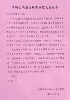 圖為倡議書 為增強(qiáng)防火意識,做到文明祭掃,3月16日上午,臺州南收費(fèi)所在向過往司乘人員發(fā)放《清明文明祭掃和森林防火倡議書》,倡議大家做明辨是非的守法者:不燒紙錢、不放鞭炮、杜絕野外用火和亂伐林木行為;做文明祭掃的踐行者:提倡用植樹、獻(xiàn)鮮花、花籃等方式祭祖;做綠色新風(fēng)的傳遞者:勸導(dǎo)家人和朋友文明出游;做進(jìn)退有節(jié)的同行者:發(fā)生山火,理智救火。