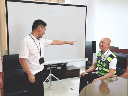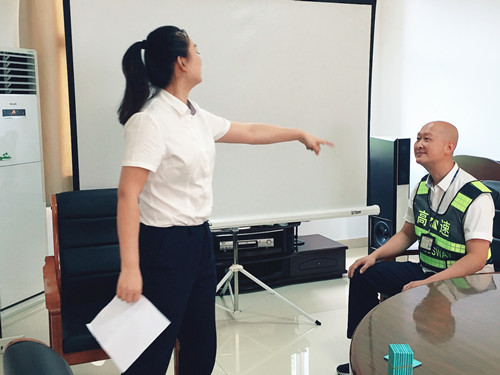 圖為員工扮演駕駛人員 此次培訓一改枯燥乏味的傳統(tǒng)形式,工作人員結合平時窗口實際工作,分別擔任角色扮演,生動而又形象地演繹窗口服務,真實地反映出收費員在收費過程中遇到的各類情景。比如:ETC車道無法正常通過、遇堵車分流、駕駛員情緒激動、綠農車混裝未達到免費、入口如何勸離超限車輛等各類突發(fā)事件應急處理辦法。