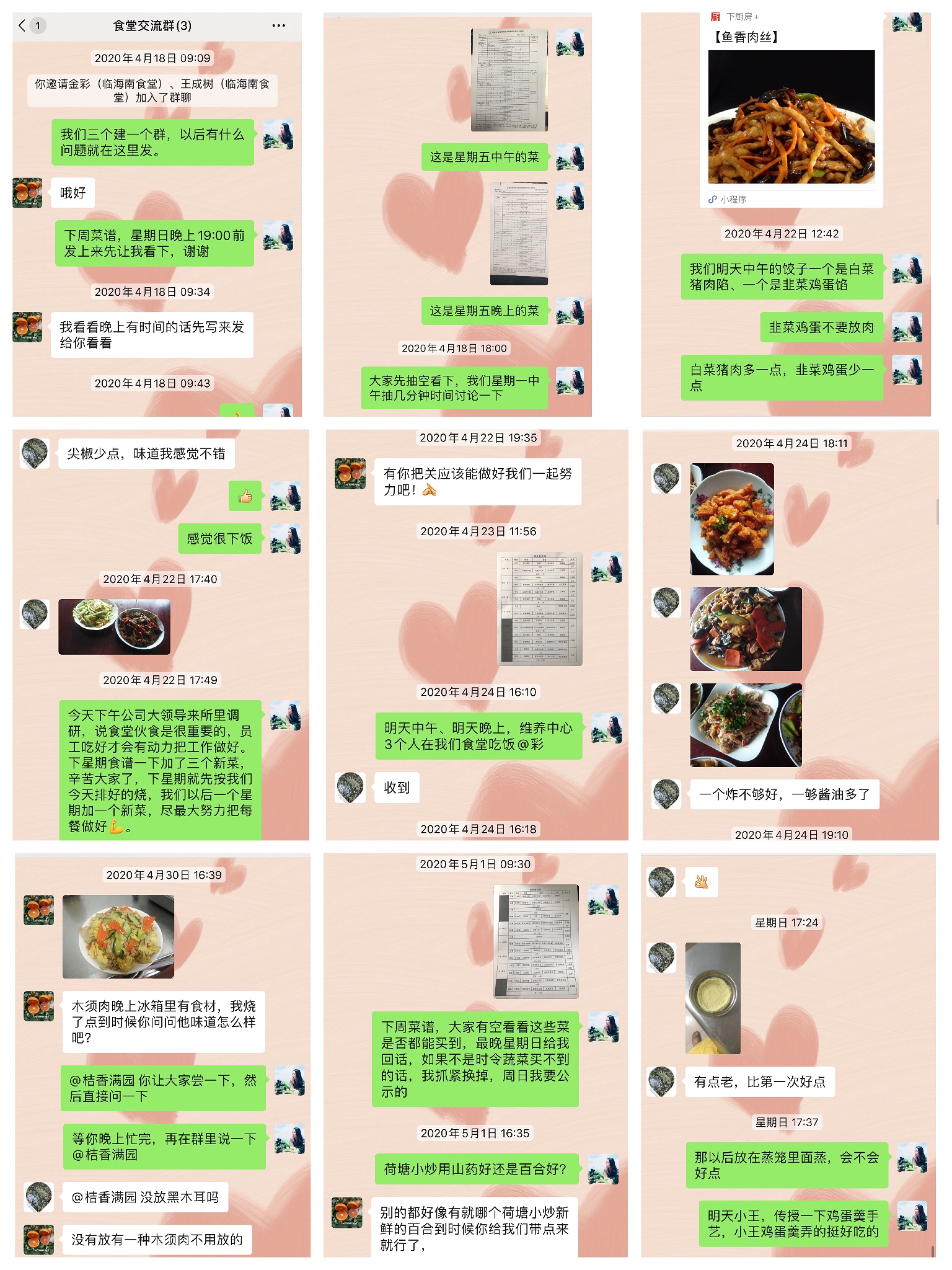 今年4月中旬,所務(wù)陳瑩利用微信建立了食堂交流群,經(jīng)常在群里上傳從網(wǎng)上、廚房APP上下載的一些簡單又美味的家常菜制作方法。并結(jié)合食堂人員的特長,針對季節(jié)變換,合理調(diào)整飲食,做到葷素搭配、飯菜每班一日三餐不重樣等要求,提前列出每周菜譜,要求食堂人員根據(jù)菜譜,每周針對創(chuàng)新家常菜,提前準(zhǔn)備少量食材,精心燒制,待嘗試滿意后再供應(yīng)。
