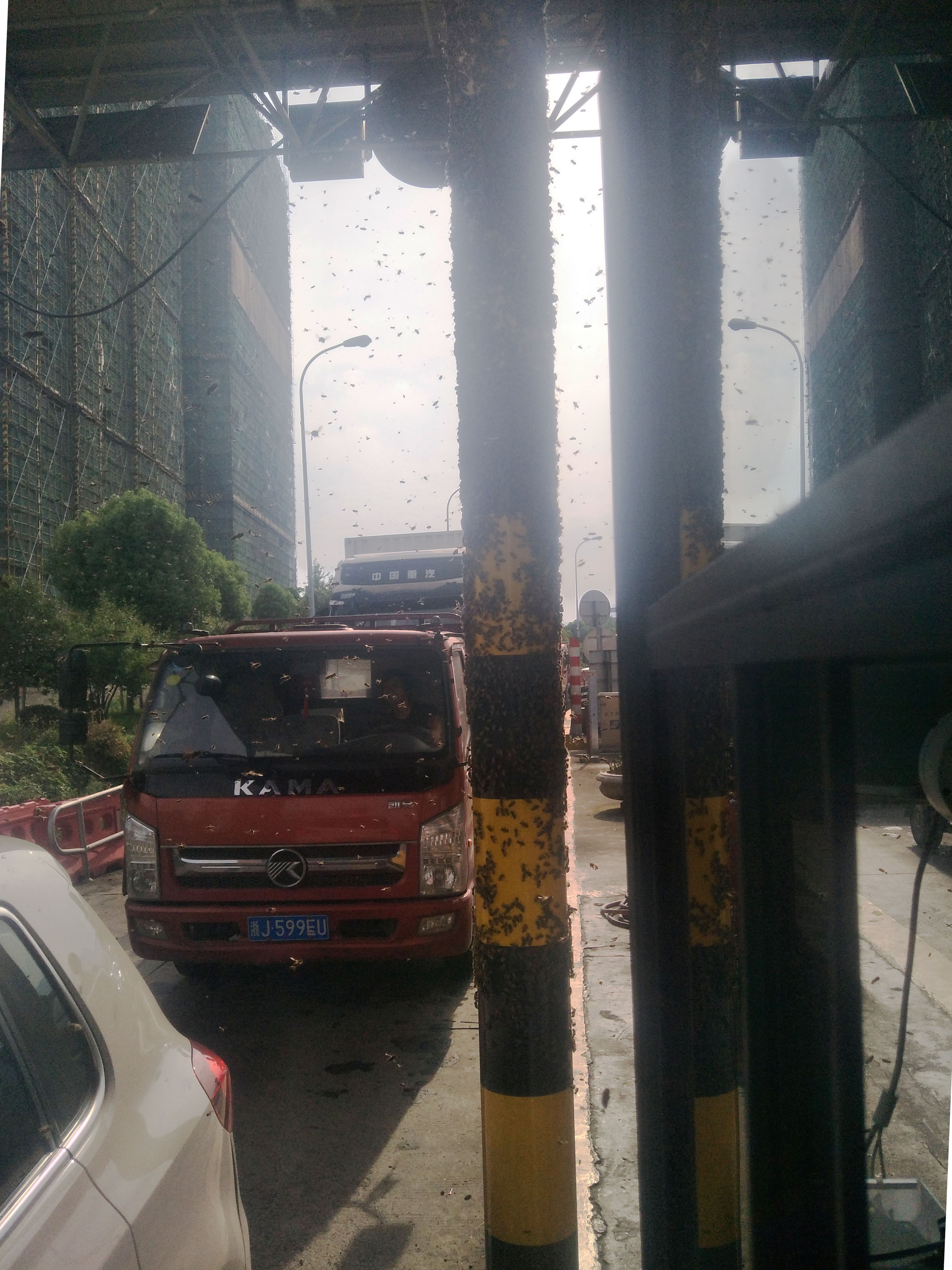 圖為蜜蜂集聚在收費(fèi)站 原來這輛綠通車運(yùn)輸蜂箱,由于蜂箱沒有關(guān)閉嚴(yán)實(shí),在車通過車道檢查稍作停留時(shí),大量的蜜蜂乘機(jī)逃出,圍攻收費(fèi)崗?fù)ぃ炜账查g一片密密麻麻。它們有的停留在車道的防撞柱上,有的在收費(fèi)窗口附近盤旋,遲遲不肯離開,嚇得過收費(fèi)站等待繳費(fèi)的司機(jī)不敢開車窗繳費(fèi)。
