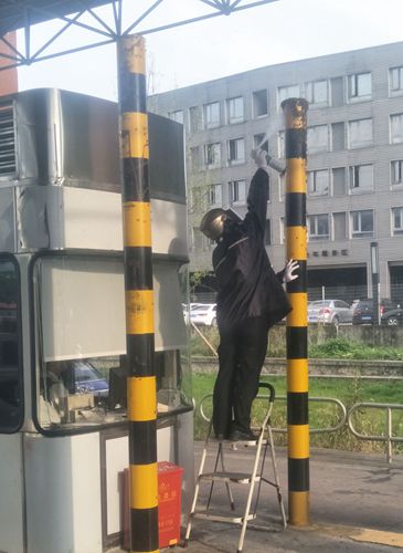 圖為工作人員用殺蟲劑噴射蜜蜂 當(dāng)班副班長(zhǎng)何丹燕立即將車道內(nèi)情況報(bào)告給所領(lǐng)導(dǎo),副所長(zhǎng)何先林聽聞后急急披上雨衣,戴上頭盔和手套,迅速趕到車道,經(jīng)過簡(jiǎn)單防護(hù)的他用殺蟲劑噴射蜜蜂集聚的位置。與此同時(shí),何丹燕疏導(dǎo)后方車輛從其他車道通行。