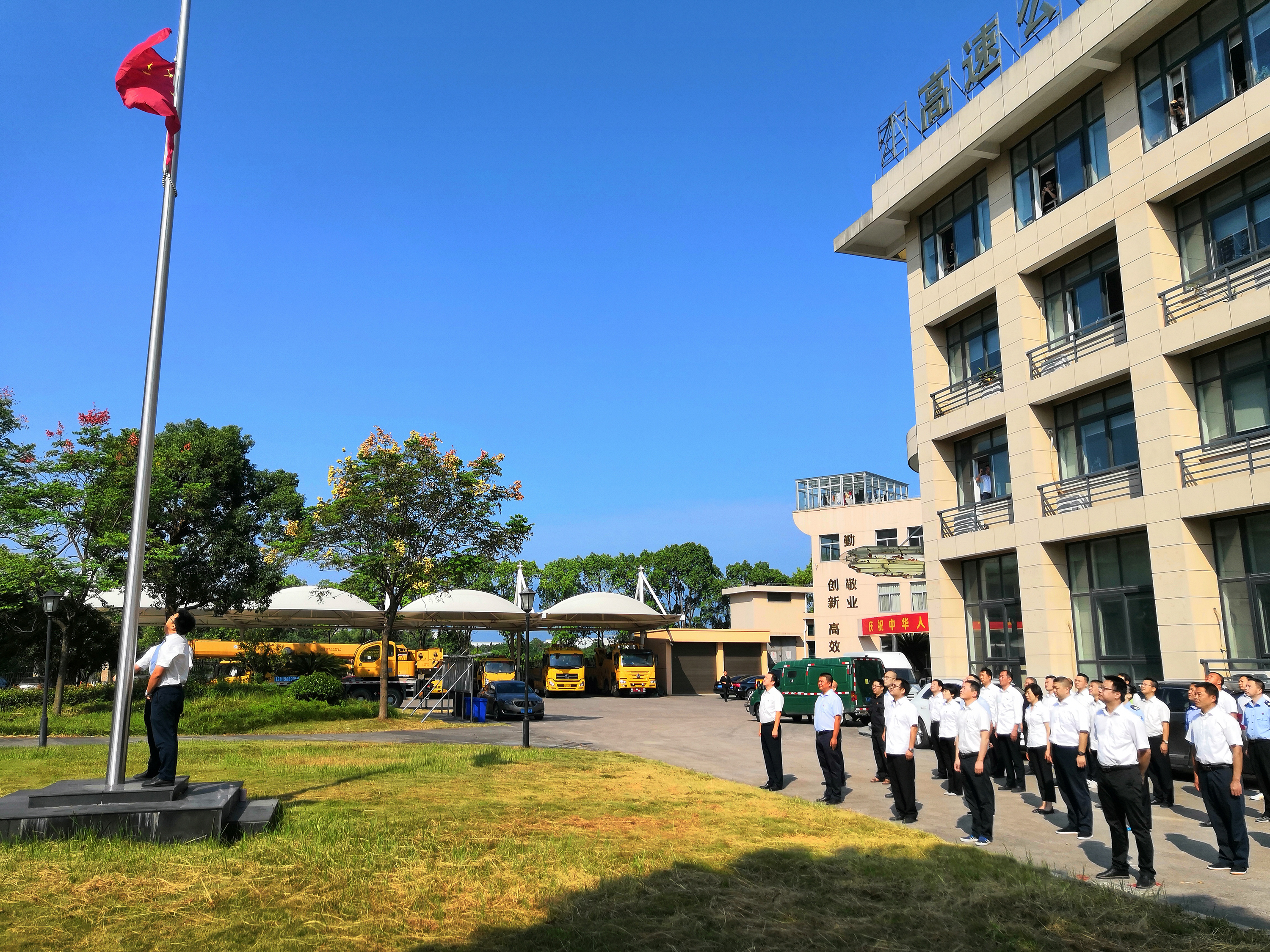 臺(tái)州收費(fèi)所聯(lián)合多部門(mén)組織開(kāi)展“迎國(guó)慶 升國(guó)旗”儀式   9月29日,國(guó)慶前夕,臺(tái)州收費(fèi)所聯(lián)合監(jiān)控中心、維養(yǎng)中心、施救中心舉行莊嚴(yán)而隆重的升旗儀式活動(dòng),慶祝中華人民共和國(guó)成立70周年。現(xiàn)場(chǎng)共有40多人參加。