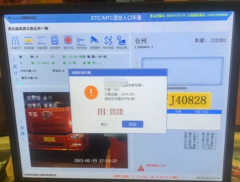 自取消省界收費站全國高速公路聯(lián)網(wǎng)后,跨省追繳通行費一直是個大難題,不少司機的省外通行費因無法追繳,造成通行費不斷流失。交通部為了適應(yīng)“全國一張網(wǎng)”稽核業(yè)務(wù)工作需要,確保各收費站現(xiàn)場有序處理追繳名單車輛,避免造成社會輿情和人身財產(chǎn)安全事件,研發(fā)了全國稽核通行費補費系統(tǒng)。      2月19日晚17點50分左右,臺州收費所進口迎來一輛車牌為浙J開頭的六類貨車,車道屏幕顯示為“浙J XXXXXX追繳名單車輛,欠費4次,欠費金額1074.9元,請同步補繳APP處理?!碑敯嗍召M員見此詢問駕駛員是否欠費,并喊來當班班長張錚過來處理。