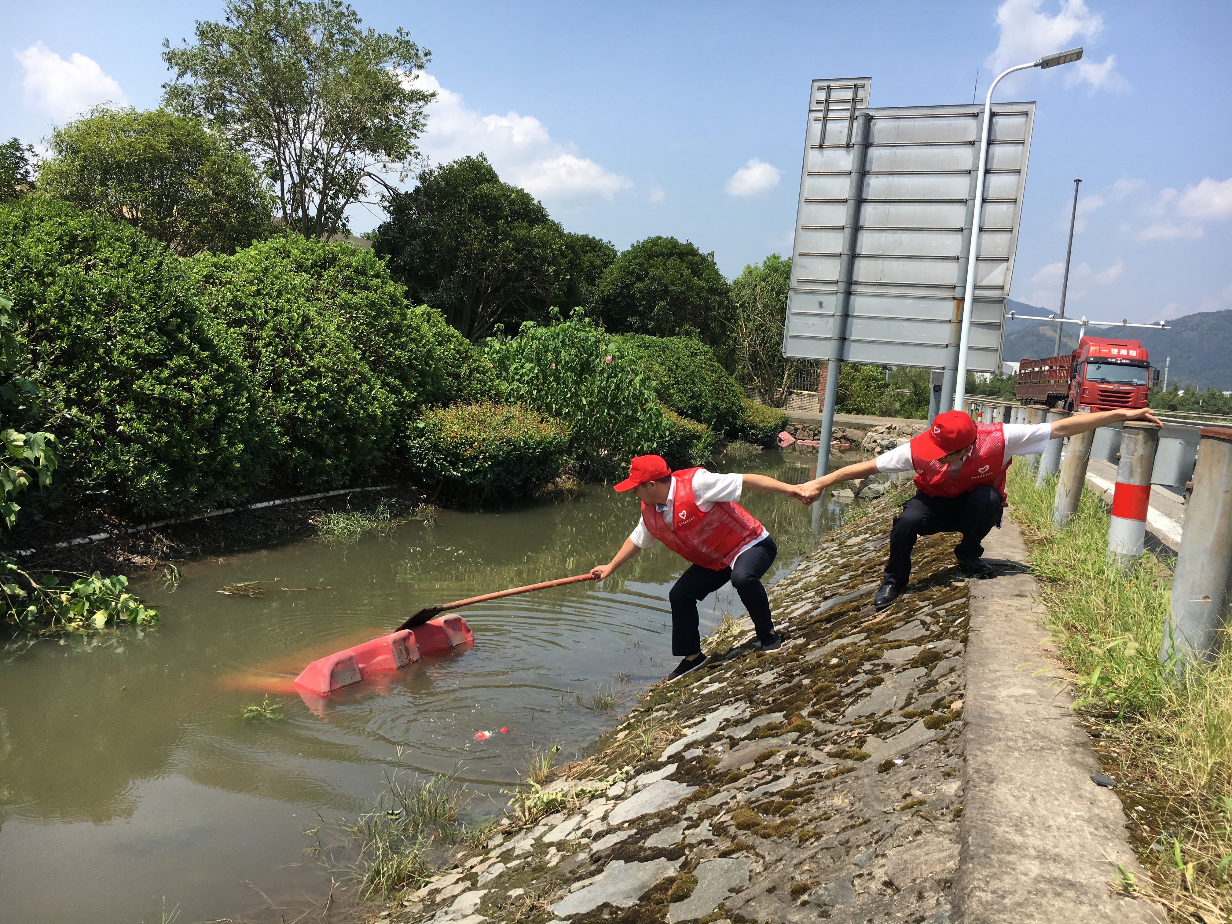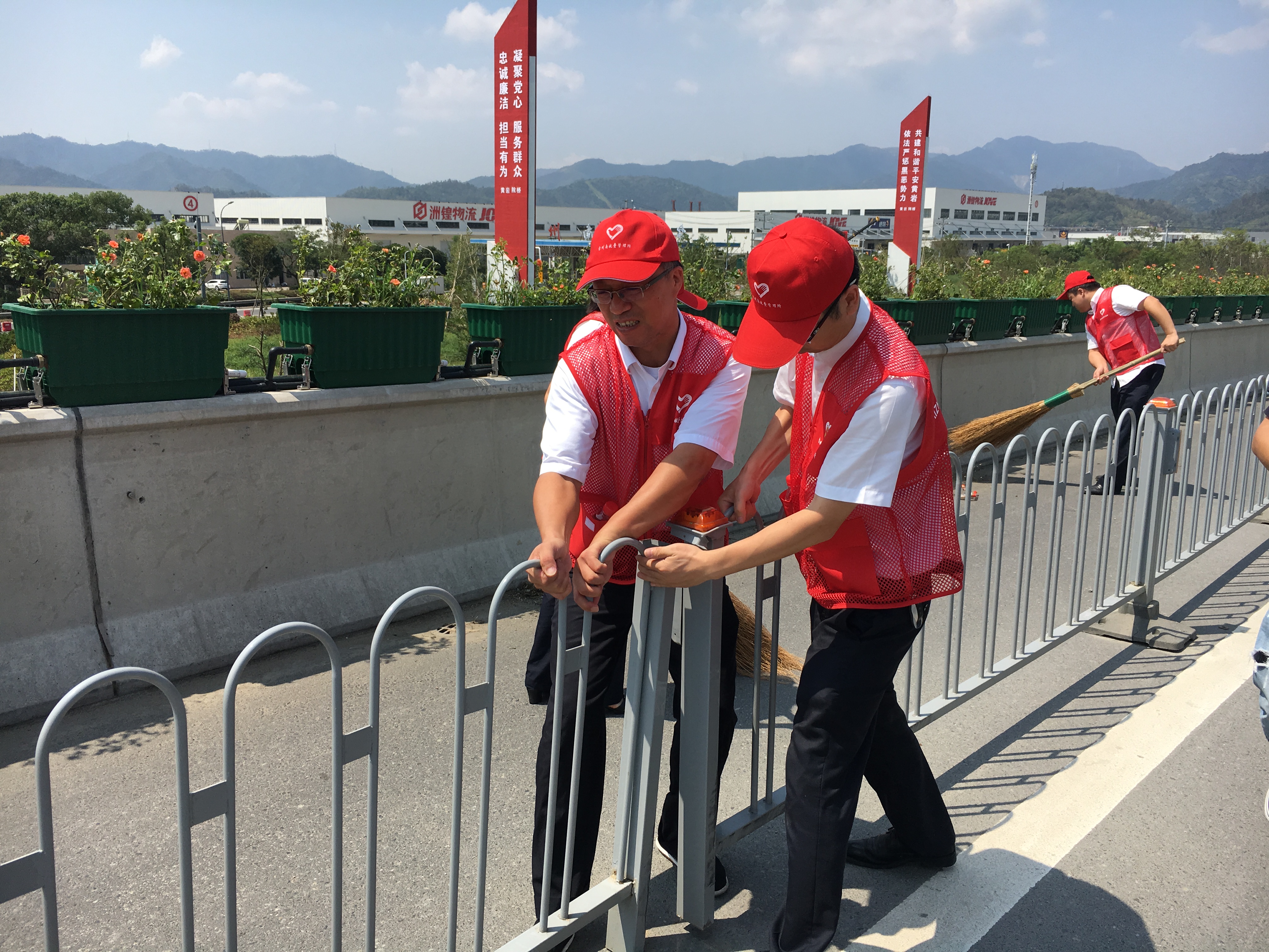 圖為志愿服務(wù)現(xiàn)場 隔離護(hù)欄被風(fēng)吹歪的,將其扶正,并作簡單的固定;綠化帶好多樹被連根拔起,找來撐桿、繩子進(jìn)行加固;斷枝殘葉滿地都是,就用手撿,用掃把掃,集中堆放倒伏的斷枝;清掃路上的垃圾;清除路障;打撈被風(fēng)吹入邊溝的水馬;對收費(fèi)區(qū)域的衛(wèi)生來了一次大清理…… 臺風(fēng)后氣溫升高,空氣濕度大,天氣異常悶熱,志愿者們揮汗如雨,一個個臉被曬得通紅,他們卻沒有因此放下手中的工具,停滯清理的步伐,迎“熱”而上,為災(zāi)后的恢復(fù)貢獻(xiàn)自己的力量,用行動踐行初心和使命。 夏蓮萍