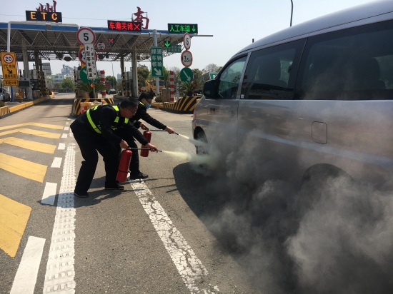 圖為交通事故應(yīng)急演練 在收費廣場交通事故應(yīng)急預(yù)案演練中,該所模擬了汽車在收費車道起火的交通事故。事故發(fā)生后,當班班長第一時間啟動預(yù)案,將險情報告監(jiān)控員,并立即關(guān)閉事故車道,組織人員對起火點進行前期壓制,同時指揮人員擺放標志,引導(dǎo)后續(xù)車輛,并快速放行。接到險情報告的所長、辦公室人員迅速趕到現(xiàn)場參與救援:女同志協(xié)助班組開足車道;部分男同志負責(zé)出入口車輛的疏導(dǎo)指揮工作;其余人員負責(zé)對火災(zāi)進行撲滅……大家各司其職,快速處理險情。