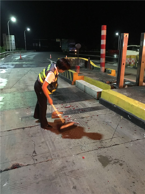 為了保暢通,收費(fèi)班長(zhǎng)讓司機(jī)拍照后開到外面等待處理,車輛駛離車道后,發(fā)現(xiàn)稱臺(tái)上罩殼跟防護(hù)欄被擠彎,地上剩下一堆玻璃碎片殘?jiān)0嚅L(zhǎng)正在處理相關(guān)事宜時(shí),發(fā)現(xiàn)收費(fèi)員張小芬已經(jīng)麻利的在車道上清理殘余碎片,不多久就恢復(fù)了超寬車道通行。