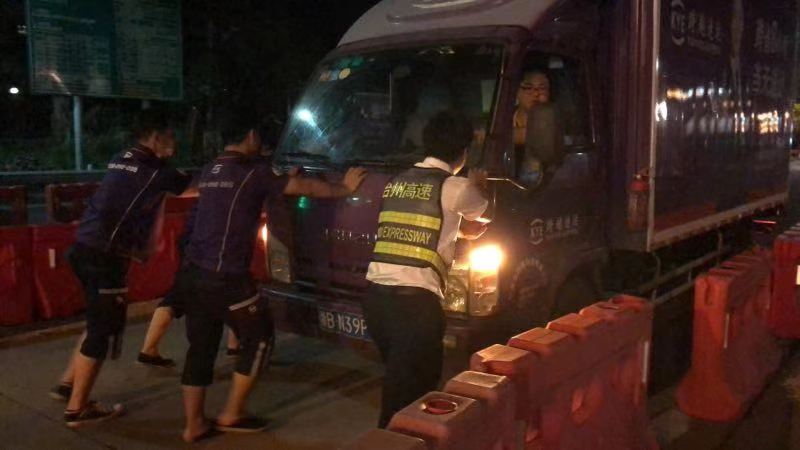 圖為收費(fèi)員幫助司機(jī)將故障車(chē)輛推出車(chē)道  8月15日凌晨1點(diǎn)多,溫嶺西收費(fèi)所征費(fèi)二班安全員在日常巡邏時(shí)發(fā)現(xiàn)一輛小型貨車(chē)停在進(jìn)口內(nèi)廣場(chǎng),在詢(xún)問(wèn)司機(jī)后得知車(chē)輛因出現(xiàn)故障導(dǎo)致無(wú)法發(fā)動(dòng)。安全員當(dāng)即叫來(lái)旁站人員,與兩個(gè)司乘人員一起用力,慢慢地將該車(chē)推出車(chē)道。在婉拒了司機(jī)遞香煙的好意后,安全員囑咐司機(jī)盡快聯(lián)系人員前來(lái)解決,后回到崗位繼續(xù)工作。