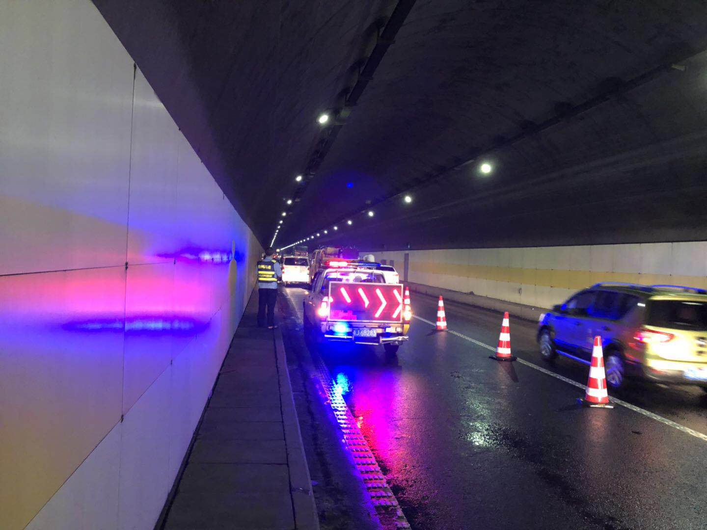 7月14日19時22分,中控員朱金飛發(fā)現(xiàn)黃土嶺寧向隧道1000米快車道處有車拋錨。立刻呼叫執(zhí)勤隊前往處置,隨即更改快車道交通信號。 執(zhí)勤隊迅速出警,幾分鐘后就趕赴事故現(xiàn)場,發(fā)現(xiàn)一輛白色面包車撞在隧道內右側,車輪箍嚴重受損,卡在護溝里,所幸無人員受傷。執(zhí)勤隊進行提前預警,預防二次事故的發(fā)生,并呼叫高速施救車輛支援,幾分鐘后施救車抵達,事故車輛安全拖離隧道,僅僅十分鐘,交通就恢復暢通。