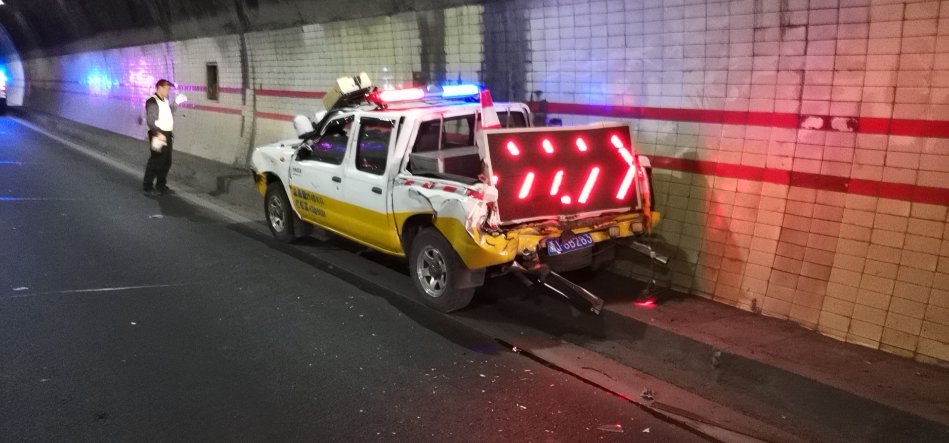 圖為事故車輛 憑著多年積累下來的經(jīng)驗,洪瑞立刻判斷該車肯定存在異常情況,趕緊使用巡邏車內(nèi)的廣播反復呼叫,提醒貨車靠邊停車檢查,并將此情況反饋到中控室。然而貨車并未停下,為了確保貨車的安全,巡邏車開啟警示燈,拉起警報,給該車預警。 當車行駛到馬鬃嶺隧道時,執(zhí)勤隊員從后視鏡發(fā)現(xiàn)后方有另一輛大貨車正快速逼近,沒有任何減速的傾向。這一刻,留給他們的只有兩個選擇:往左拐,時間緊張,一個處置不當,會出現(xiàn)尾部被撞后再次追尾前方貨車的前后夾擊險情,后果不堪設想;或者在被撞時的一瞬間采取正確的應對措施,在操作時絕不能有一丁點的遲疑,逃生的時機僅有幾秒鐘。 生死存亡的緊急關頭,隊員們及其冷靜,被猛烈撞擊時,沒有急踩剎車、誤打方向,在左側車道有車的情況下,處置正確、分毫不差,往右車道偏移了10來米,成功從夾縫中逃脫,化解了這次險情。巡邏車被撞后,兩名受傷隊員不顧傷痛,仍然堅持下車保護現(xiàn)場并對來往車輛預警,預防二次事故的發(fā)生,直到后續(xù)救援力量到達。 此次事故造成三車追尾,兩名執(zhí)勤隊員輕微受傷,雖然巡邏車損失慘重,但是因為執(zhí)勤隊員高度的工作責任心和對險情的正確判斷處置,才未造成任何司乘人員的傷亡,也未影響到隧道正常通行。 據(jù)隧道所員工了解,該貨車司機可能是凌晨疲勞駕駛沒有聽見巡邏車預警,在此提醒廣大司機,車輛如果發(fā)生故障,車靠邊、人撤離,即報警,切忌疲勞駕駛! 盧祖理