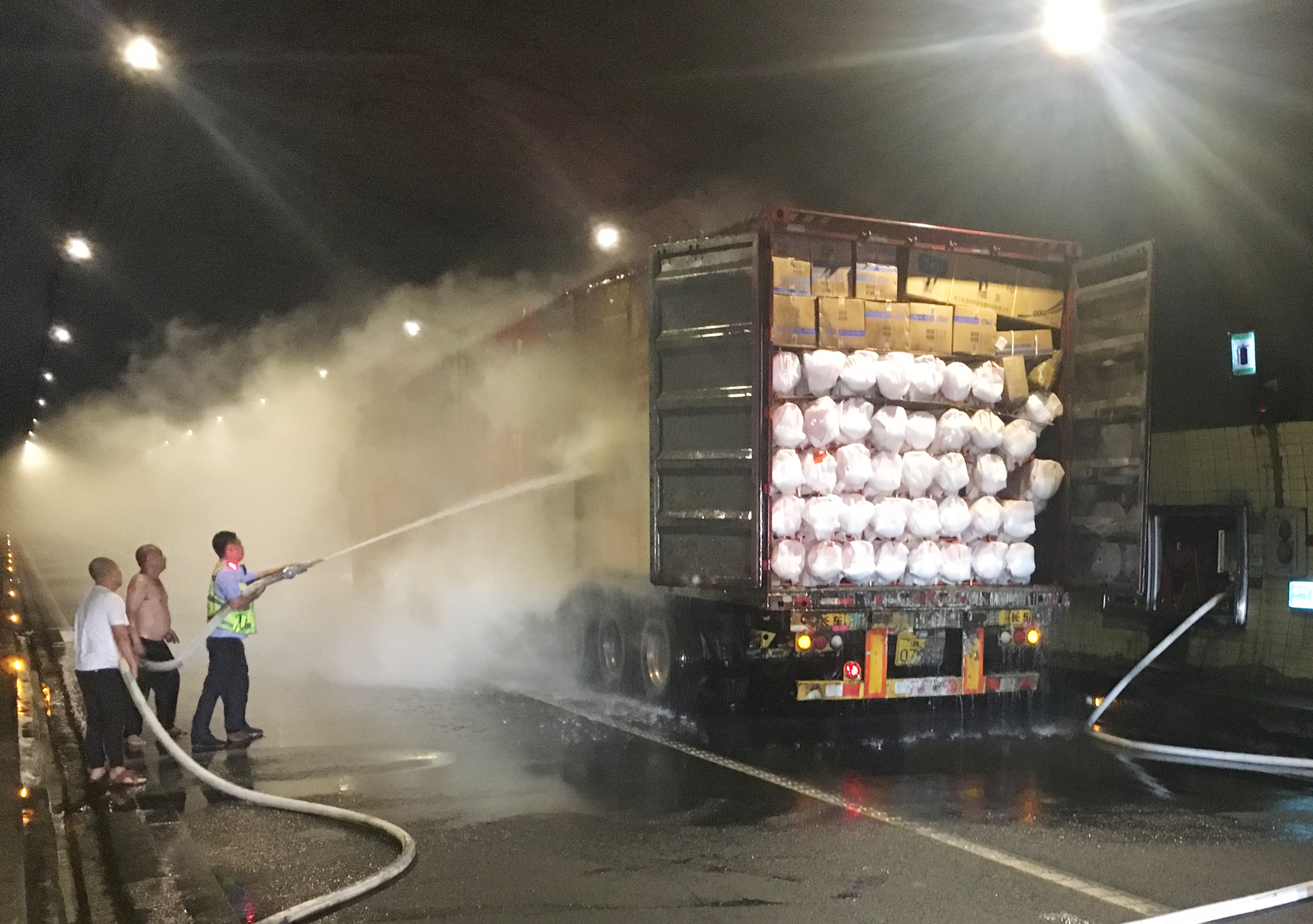 萬幸的是,恰逢溫州高速交警巡邏車經(jīng)過,隨即在該貨車后方預(yù)警,很快的所巡邏車、消防車先后到達(dá)現(xiàn)場(chǎng)協(xié)同滅火。由于該車貨物較多,且裝載物皆為紙箱和塑料,集裝箱底層溫度較高,一時(shí)只能將明火撲滅,但車廂內(nèi)仍有大量煙霧,為了安全,車子必須盡快撤離隧道,執(zhí)勤隊(duì)當(dāng)即決定讓駕駛員把車開往南廣場(chǎng)繼續(xù)滅火,消防車則一路緊隨其后滅火,以防火勢(shì)變大。