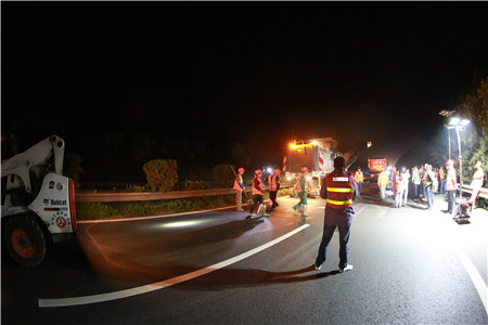 反復溝通,施工保質保進度。要在車流量極大的主干線上夜間順利施工,不僅對工程質量、進度負責,更要對安全保暢負責,不能有半點疏忽,不允許絲毫麻痹,而且涉及面極廣。不僅涉及工程部與施工監(jiān)理單位,更涉及到高速交警、路政及運營管理等多個部門,前期工程部協交警、營運部、監(jiān)理、施工等各相關單位就施工方案反復論證,一次次的討論與交流,計劃改了又改,從提前發(fā)布公告到路口設立標志,從預警車輛安排到分流時間節(jié)點,從搶險預案到應急小分隊建立,路面的反復測量,綠化養(yǎng)護的同期推進.....千頭萬緒,在于每一個細節(jié)的反復論證。一直到11號下午,確定了最合理有效的交通組織方案,施工前的安全和技術方面有了最后的交底,器械設備、材料、人員班組配備等一一清點得到最終確認。