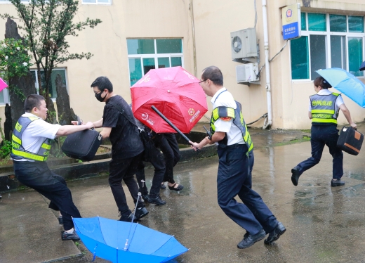 隨后,多名參演員工冒雨模擬收費崗?fù)ず土嘘犗聧徳庥觥按跬健睋尳俚那榫伴_展防盜搶演練?,F(xiàn)場,2名蒙面歹徒執(zhí)仿真刀、軟棍威脅收費員交出現(xiàn)金,危機(jī)之中,收費站立即啟動應(yīng)急處置預(yù)案并報警求助,收費員有效與歹徒周旋,應(yīng)急處置組人員迅速攜鋼叉、橡膠棒、勞動工具等赴現(xiàn)場支援,值班領(lǐng)導(dǎo)、收費班長、監(jiān)控員合力協(xié)作應(yīng)對歹徒,防盜搶演練順利結(jié)束。