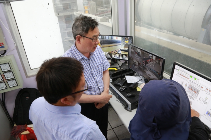 圖為陳文波一行在山海公司瀝青拌合站現(xiàn)場(chǎng)調(diào)研
