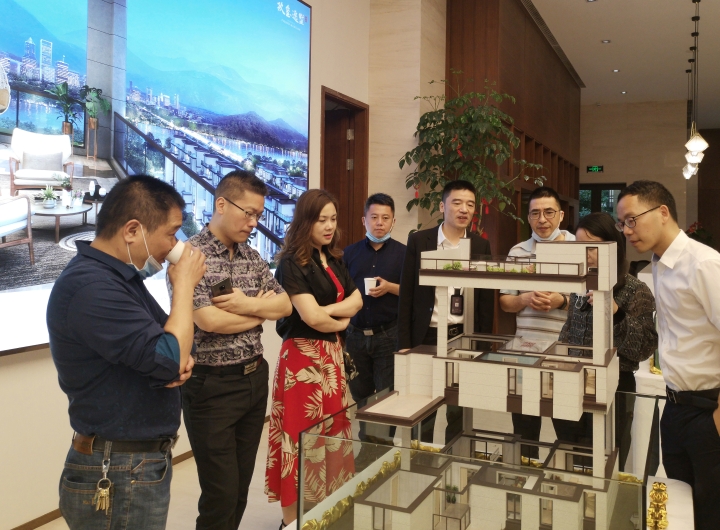 圖為陳文波對照圖紙了解樓盤情況 在銷售展廳樓盤沙盤前,陳文波聽取了高速房產(chǎn)(集團(tuán))公司負(fù)責(zé)人關(guān)于玖璽逸墅項目銷售計劃、認(rèn)籌客戶等情況匯報。他對前期房產(chǎn)公司的辛苦付出給予充分肯定,要求大家認(rèn)真服務(wù)好每一個來訪客戶,彰顯出國企品質(zhì),全力做好銷售工作。 當(dāng)天,銷售展廳樓內(nèi),陸陸續(xù)續(xù)有客戶進(jìn)出,“我很早就看中這個樓盤了,不僅位置好,而且采光好、通風(fēng)好,居住在這里一定非常舒服?!币幻麥?zhǔn)客戶張女士夸贊道,今天她特意前來交付認(rèn)籌金。  圖為客戶在疊墅沙盤前參觀