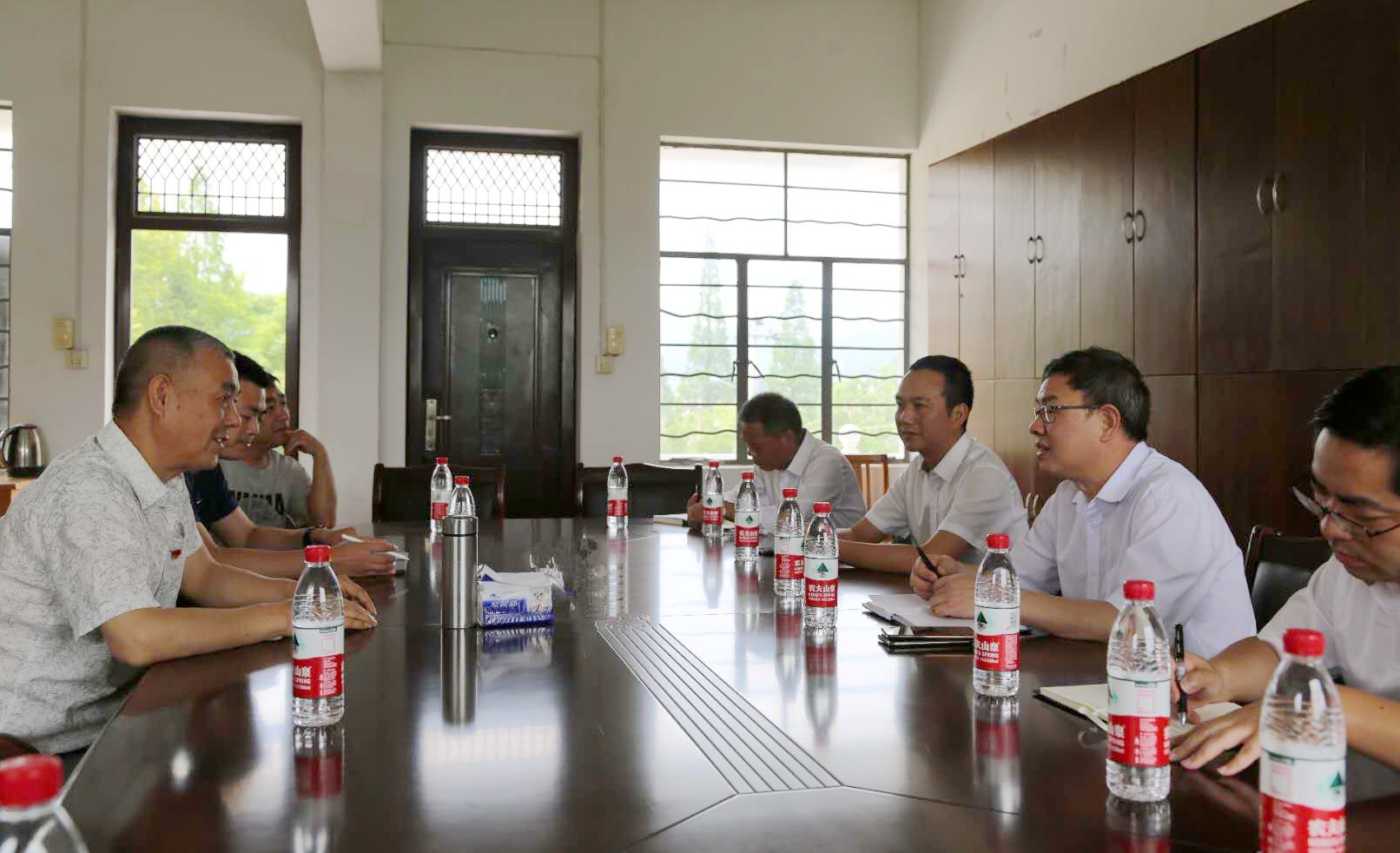 圖為陳文波與村兩委班子以及駐村指導員座談交流 在塘上村的村委會會議室里,陳文波與村兩委班子以及駐村指導員進行座談交流。塘上村村支書、村長,以及其他村干部分別向陳文波等介紹了村里近期的基礎設施建設、村民生產(chǎn)生活、產(chǎn)業(yè)扶貧措施、文化禮堂建設等工作中的重點難點問題,同時代表村民感謝臺州高速集團長期以來對塘上村的支持和幫助。