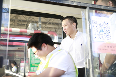 圖為集團副董事長、總經(jīng)理張建平在溫嶺西收費崗?fù)z查