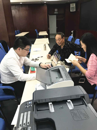 戴著一副黑框眼鏡,憨實(shí)魁梧的身形,說話輕言慢語。據(jù)說,某天下班后,還坐在椅子上打電話,一臉溫柔,竊竊私語,同事一直以為他在談戀愛,這打完了電話,才知道是接到股東的電話了,跟對方在解釋股權(quán)收購政策呢。 在股權(quán)流動收購點(diǎn),小李是電腦操作人員,所以也不大參與解說工作。只是那天正好一位阿婆坐在了電腦對面,說話之間才知大字不識,是聽鄰居說的,就自己摸到這里了。正好手里也空了,李騰飛頓頓身子,放松下來,以黃巖特有的吳言儂語跟阿婆解釋了十幾分鐘,果然,白凈的臉上是一臉的和氣,沉穩(wěn)又實(shí)在,確實(shí)是傳說中的暖男一枚呀。末了,幫阿婆代簽了字,讓阿婆按了手指印。 但是,在工作的時(shí)候,小李讓我們見識到了“騰飛”的效果。流動點(diǎn)只設(shè)一臺筆記本電腦,線上操作都?xì)w他,在大溪鎮(zhèn)政府,來的股東有百十號,流動小組包括駕駛員何杰靚迅速開展了流水作業(yè)。此時(shí)此刻,小李那一雙肥白的大手在小巧的鍵盤上十指翻飛,靈活敏捷,操作如行云流水,打印機(jī)刷刷地響,不停飛出一份份協(xié)議,傳到下一個(gè)工作人員這里。這才知道,每一個(gè)人的名字都是名副其實(shí)的,“騰飛”的含義是在這里體現(xiàn)的呀。 鄭蔚