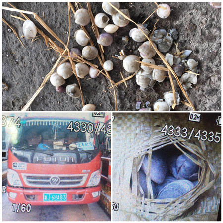 11月2日上午10:39分左右,車牌為浙J6HA83的小貨車駛?cè)霚貛X西收費(fèi)所2號(hào)崗?fù)?,該車駕駛員稱自己運(yùn)載的貨物為綠農(nóng)產(chǎn)品,要求免費(fèi),堵塞車道一個(gè)多小時(shí)。最后在取證報(bào)警下,駕駛員交付通行費(fèi)320元。 該車被篷布包著,車上貨物又被袋子緊緊包著。當(dāng)工作人員要求檢查取證時(shí),駕駛員只摳開指定的袋子,并且口子開得非常小,只讓人隱約看到貨物是貝殼。工作人員按規(guī)定要求駕駛員打開另一處取證,駕駛員以貨物被繩子綁著不好打開為由,只在前端把袋子摳了一個(gè)比硬幣大點(diǎn)的小洞,拿出幾個(gè)貝殼,工作人員看到其拿出的貝殼不管是在大小還是顏色上,都和他剛才指定的那袋貨物有明顯區(qū)別,于是工作人員親自用手摸進(jìn)去查驗(yàn),經(jīng)仔細(xì)檢查,貨物屬于貝殼中的殘次品,懷疑是飼料用途。