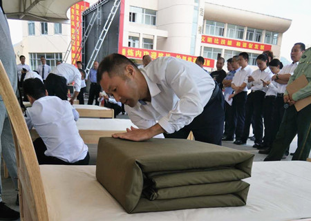 圖為工作人員參加員工技能大比武疊被子比賽