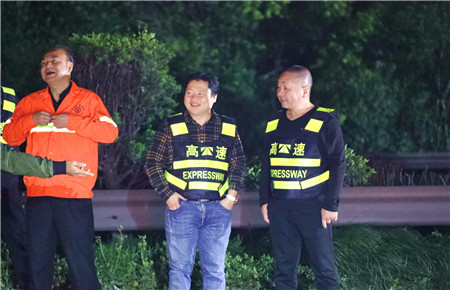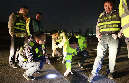 圖為工程養(yǎng)護部經(jīng)理何翔堅守在夜間封道施工現(xiàn)場