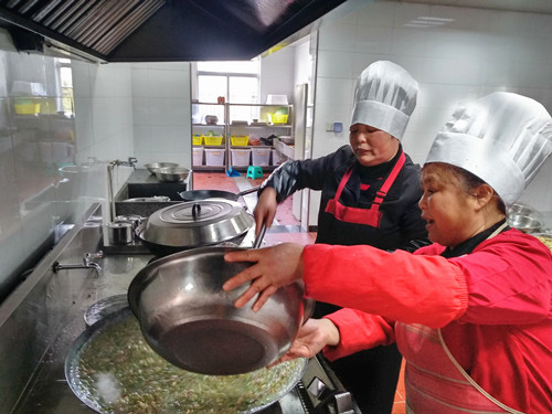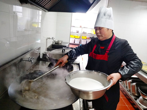 浸了一夜的早米,用石磨磨成米漿,細膩而幼滑,被靜置在盆里?!耙话愣加妹追叟菟诟写植?,而且吃起來沒有香頭?!崩ㄒ贿呎f,一邊將香腸切碎與豆腐、冬筍、胡蘿卜、芹菜、香菇、蠶豆瓣翻炒著。旁邊的大鍋里,長長的豆面在骨頭湯里翻滾著,像一棵棵舞蹈的海草。徐徐倒入的米漿,被不停地攪拌,“要是粘到鍋,就會有焦糊味,這鍋羹就算廢了?!泵诐{好像不夠,利花有些懊惱,“要是在家里,米漿都會多準備一些,不夠就隨手添,我?guī)У竭@里就這些,也沒得加了?!本徒性谝贿呑鰩褪值拿妹脤毣ㄓ妹娣酆蜕椒郏ㄒ簿褪欠矸郏剿杵饋?,倒入鍋里,湯漸漸濃稠起來,倒入之前炒好的配料,加上切得細細的綠綠的芥菜梗、芥菜葉、海蠣,鍋里不時冒起大泡,香氣四溢。 為照顧吃不慣糟羹的同事,食堂還準備了一鍋甜的山粉糊。來自臺州各縣市區(qū)的同事,按各自飲食習慣選擇了咸的或甜的。有說芹菜的味道蓋過了芥菜清香的,有說沒有加入芋頭口感不夠糊的,但撲鼻的香氣和濃厚豐富的口感立刻讓人忘了挑剔。對我來說,碧綠的芥菜葉和白胖的海蠣肉是整碗羹的顏值擔當和靈魂所在。 每個元宵節(jié),對于在崗的同事們是沒有花燈可看、沒有燈謎可猜的,也不能與家人聚在一起吃羹。車道上此刻正是流量高峰期,大家匆匆吃完,都要趕著上崗。食堂大姐把多出的糟羹和山粉糊放進蒸飯鍋保溫,叮囑大家下班后再來吃點,這個吃了不扛餓。此時,除了食物最能體現(xiàn)節(jié)日氣氛外,還有那一份特意為你留著的溫熱更讓人感動。 鄭瑛芝