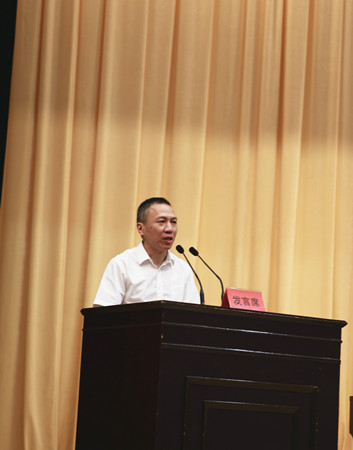 圖為集團(tuán)黨委副書記、副董事長、總經(jīng)理張建平在主席臺上作交流發(fā)言