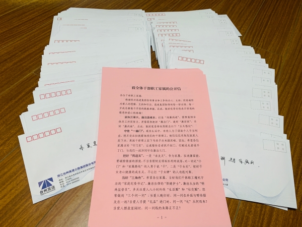 集團(tuán)開(kāi)展致全體干部職工家屬的公開(kāi)信活動(dòng)   6月18日,集團(tuán)緊貼廉政教育月活動(dòng)要求,將“致全體干部職工家屬的公開(kāi)信”交到每一名職工手中,以這種家書(shū)形式廣泛宣傳廉潔清正的重要性,呼吁他們爭(zhēng)當(dāng)反腐倡廉的“廉內(nèi)助”。