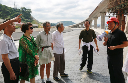 圖為在6#立交上了解工程建設(shè)情況 老干部一行實(shí)地踏勘了內(nèi)環(huán)路(黃巖段)各施工現(xiàn)場(chǎng),全面了解了四個(gè)標(biāo)段工程當(dāng)前建設(shè)情況。一路上,老干部們一面聽取各標(biāo)段工作匯報(bào),一面用手機(jī)相機(jī)記錄現(xiàn)場(chǎng)當(dāng)前建設(shè)情況,當(dāng)知道今年11月11日內(nèi)環(huán)路將實(shí)現(xiàn)主線通車時(shí),老干部們紛紛豎起大拇指,為內(nèi)環(huán)路建設(shè)的進(jìn)度和質(zhì)量點(diǎn)贊,同時(shí)表示將多走多看,為內(nèi)環(huán)建設(shè)盡自己的一份力。 鐘彪對(duì)老干部們的關(guān)心和支持表示衷心感謝,并希望各位老干部多指導(dǎo)、多監(jiān)督、多提寶貴意見,助力臺(tái)州城市建設(shè)趕超發(fā)展。 張琛